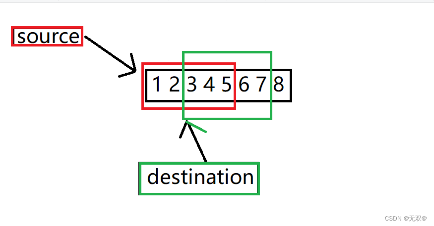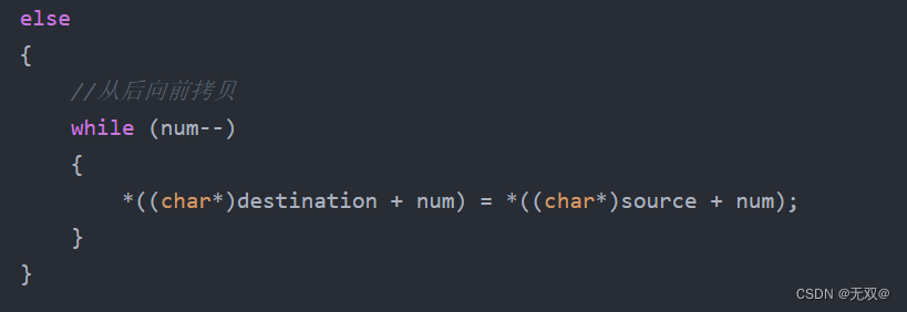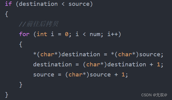 这一部分是判断destination与source的关系,如果我们此时我的destination小于source,那我们就不能从往前拷贝,而是应当选择从前往后,不然出错原因与上述所讲的一致,会被占用掉。