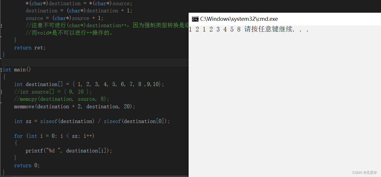 //注意不可进行(char*)destionation++,因为强制类型转换是临时的,强制类型转换完使用后就没了,这样在++就是对void*加加了,