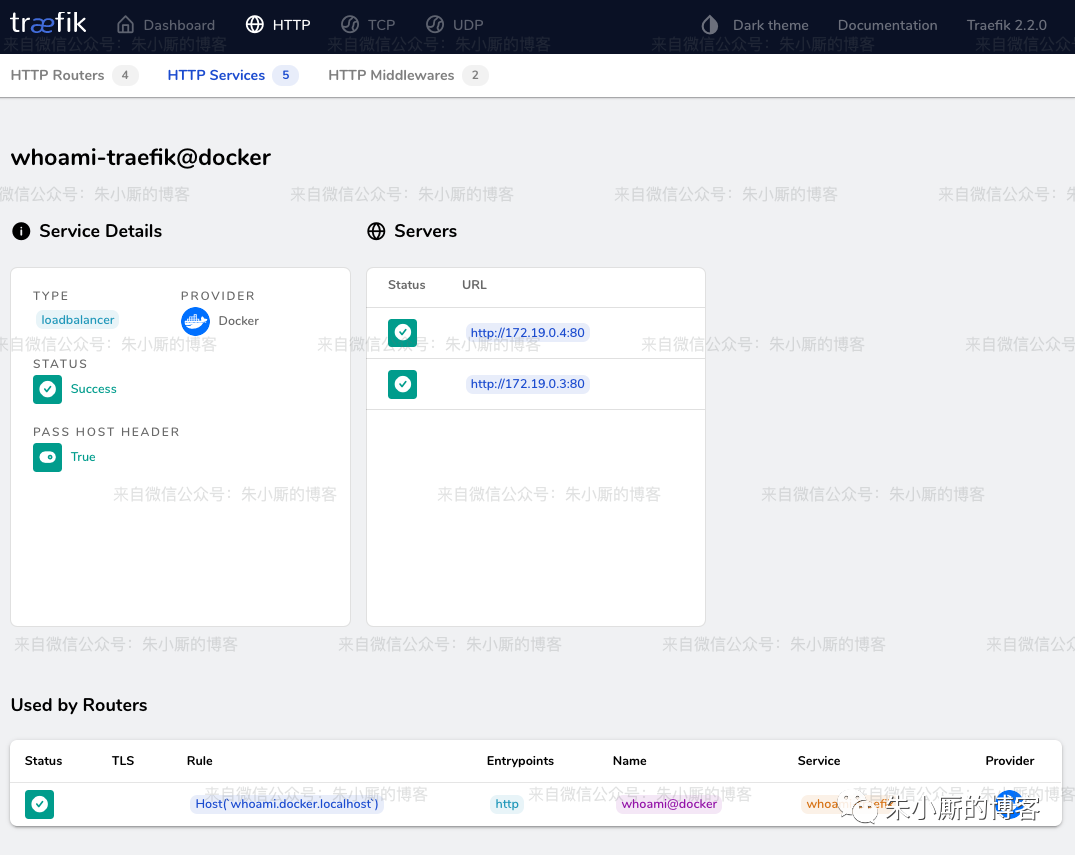 whoami 这个 http 服务做了什么事情呢?1. 暴露了一个 http 服务,主要提供一些 header 以及 ip 信息;2. 配置了容器的 labels,设置该服务的 Host 为 whoami.docker.localhost,给 traefik 提供标记。