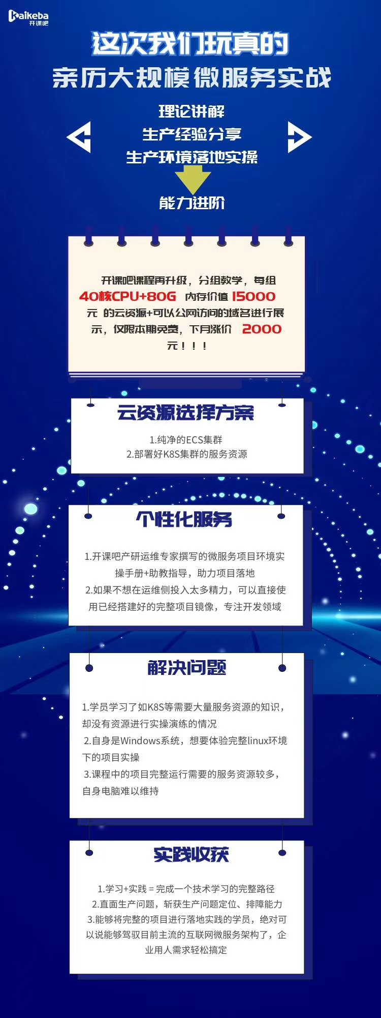 而现在,开课吧决定,向购买课程的学员,免费开放 N 个项目空间的云服务部署的实验环境,供学员们实战学习。为期 3 个月,采取分组教学的形式,每组 10 人,提供 40 核 CPU(2*12 CPU node,8 CPU master 8 CPU),80 G 内存,最终的项目可以申请到域名进行公网展示。