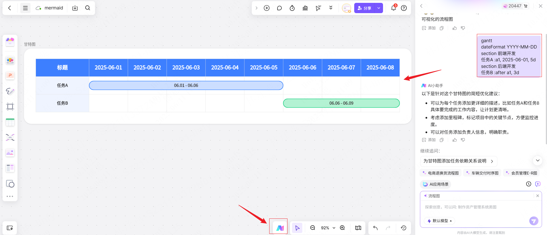 - 实操例子:在boardmix的AI助手那里,输入Mermaid代码,就能自动生成API调用的流程图。