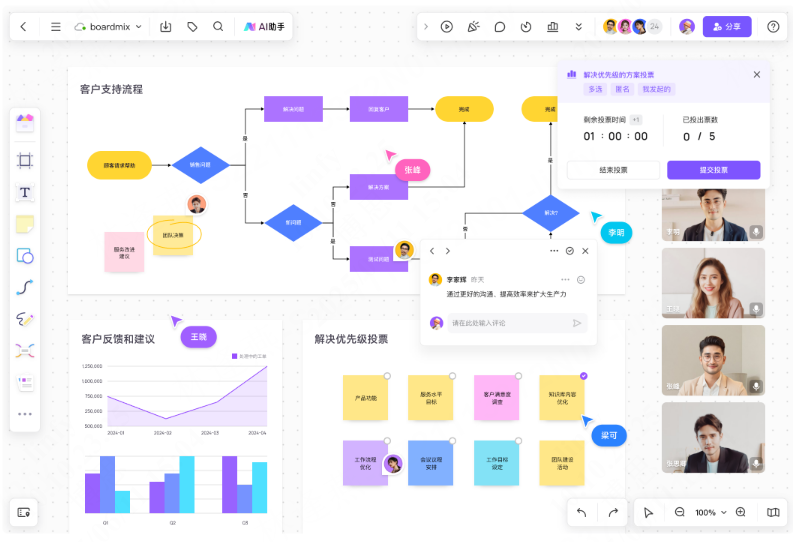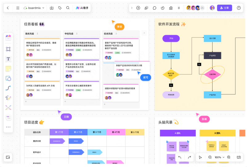 技术文档场景中,可在boardmix博思白板用Mermaid生成流程图,通过链接邀请成员协作,提升技术沟通与文档编写效率。敏捷站会中,产品经理可用boardmix的甘特图语法同步迭代计划,团队成员拖拽调整任务节点,直观管理项目进度。