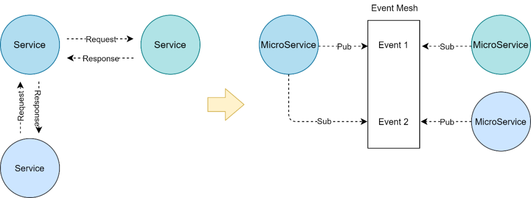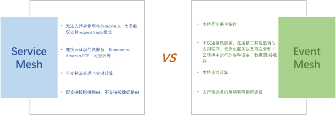 EventMesh 可以作为 Service Mesh 的补充,在应用程序之间实现更好的通信,并允许应用程序通过将某些功能放在网络层和应用程序层之间使我们可以更多地关注业务逻辑。但是,相比之下,两者有一些重要的区别: