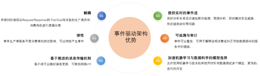 事件驱动的体系结构中,客户端无需轮询就可以接收更新,事件在到达事件存储后就会通知给客户端,客户端可以随时接收更新,这对于动态数据转换、分析和数据科学处理非常有用。