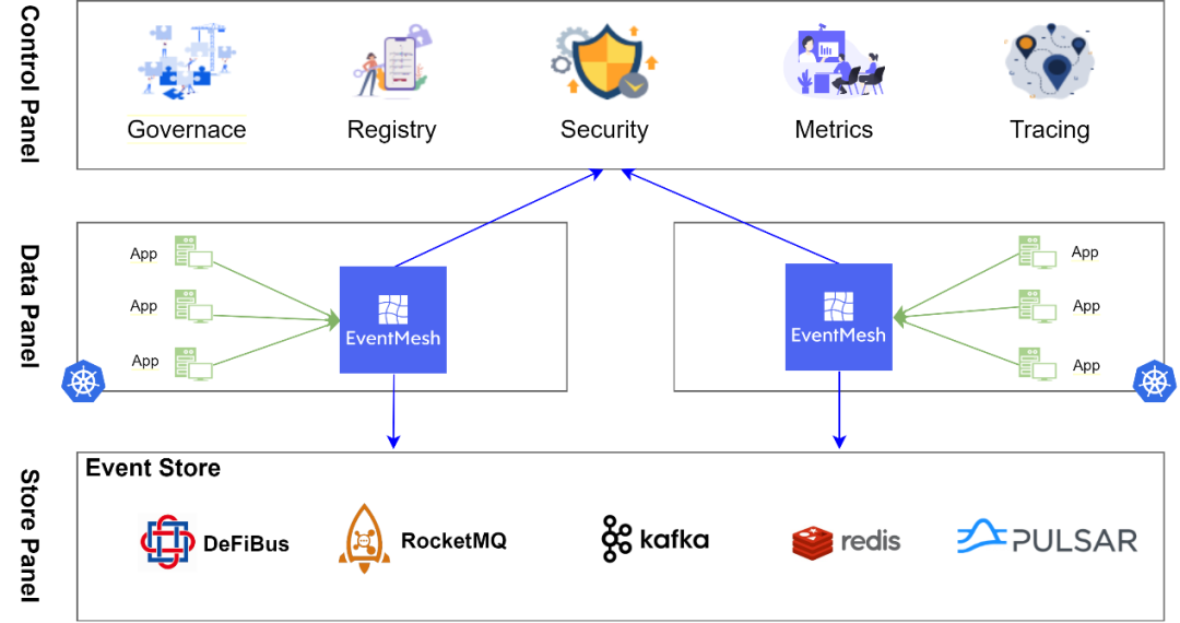 通过上图可以将 EventMesh 横向分为 Control Panel、Data Panel、Store Panel三层。