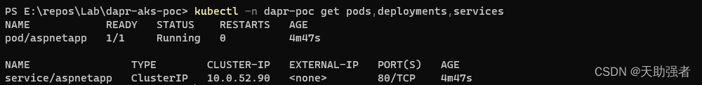kubectl -n dapr-poc get pods,deployments,services