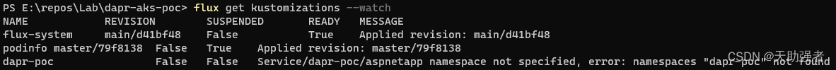 查看结果,发现出现了一个错误,找不到名称为 dapr-poc 的 namespace