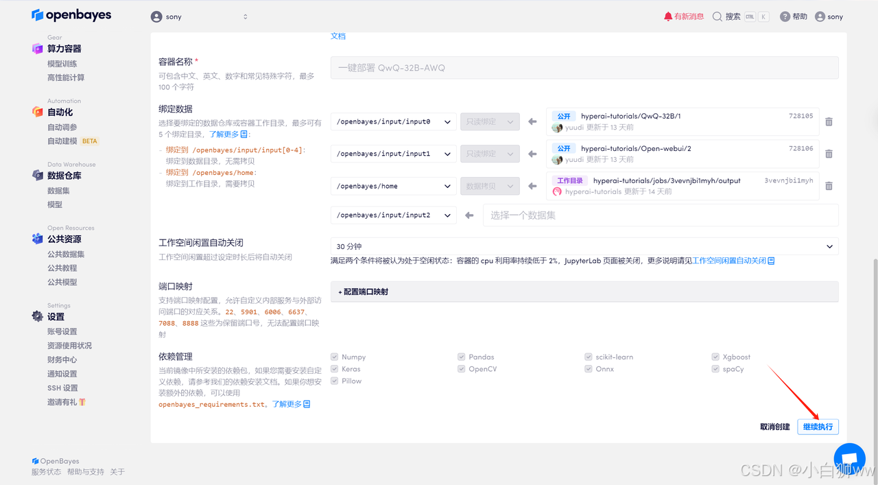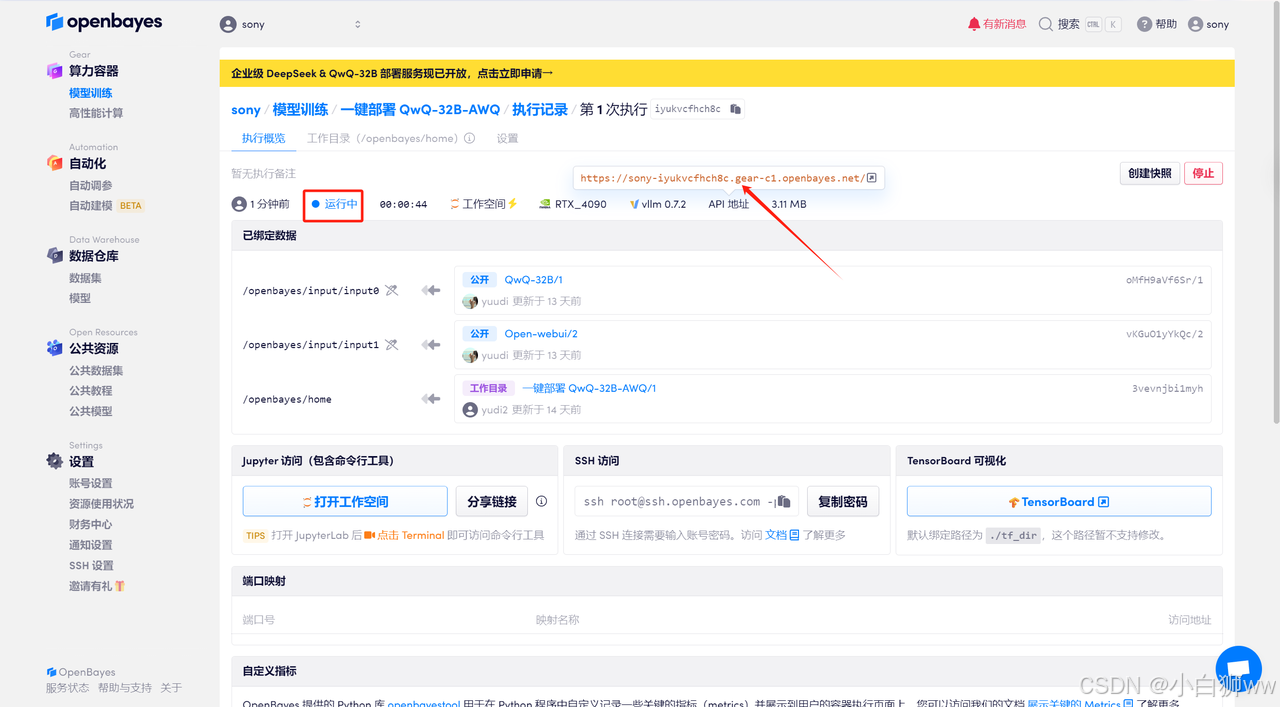 选择「NVIDIA GeForce RTX 4090」以及「vLLM」镜像,OpenBayes 平台上线了新的计费方式,大家可以按照需求选择「按量付费」或「包日/周/月」,点击「继续执行」。稍等片刻,待系统分配好资源,当状态变为「运行中」后,点击「API 地址」边上的跳转箭头,即可跳转至 Demo 页面。并且相比传统指令调优模型,QwQ 具备思考和推理能力。,在「公共教程」页面,选择键部署 「一键