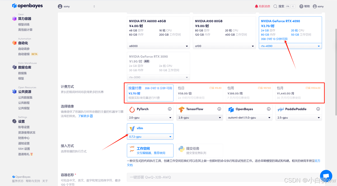 选择「NVIDIA GeForce RTX 4090」以及「vLLM」镜像,OpenBayes 平台上线了新的计费方式,大家可以按照需求选择「按量付费」或「包日/周/月」,点击「继续执行」。可以使用文章开头的邀请链接,获得 RTX 4090 使用时长!