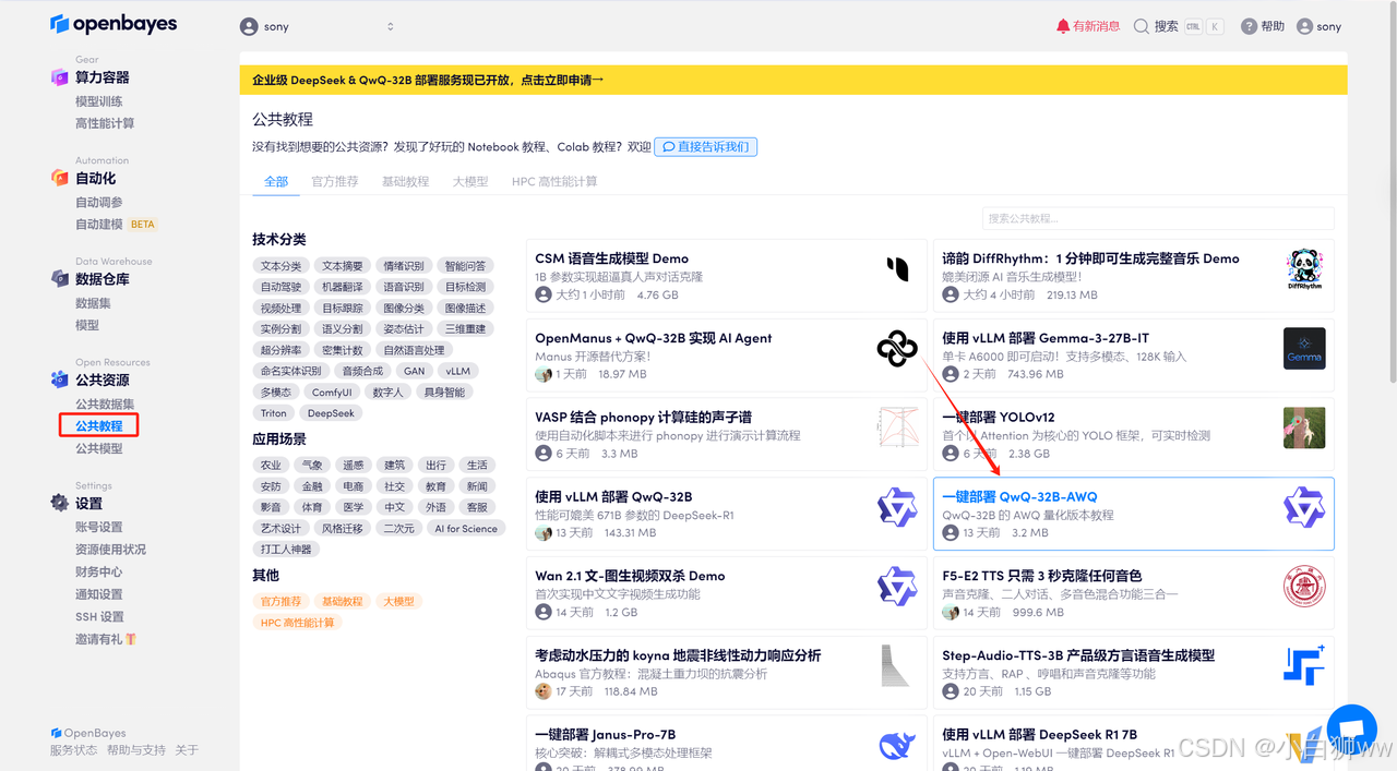 登录 http://OpenBayes.com,在「公共教程」页面,选择键部署 「一键部署 QwQ-32B-AWQ」教程。