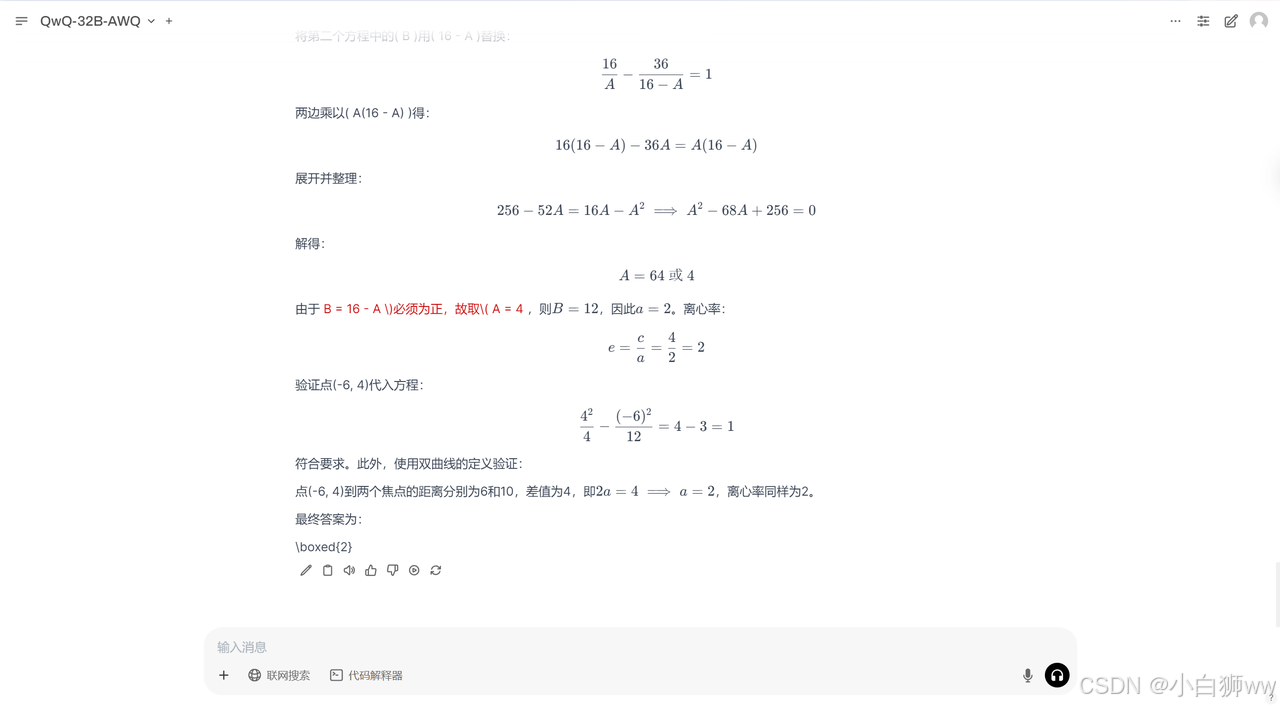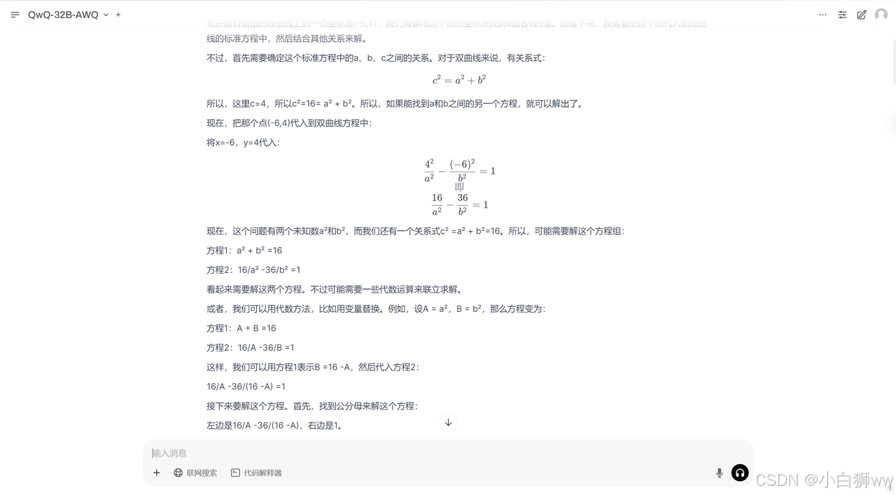 这里我们输入了一道数学题,可以看到模型很快给出了回复。并且相比传统指令调优模型,QwQ 具备思考和推理能力。