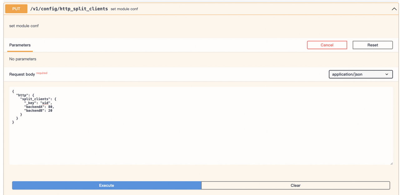 设置两组 upstream: backendA , backendB , 并通过 split_clients 指令使用 header 中的 uid 值做为流量配比,并设置 80% 的流量将指向后端 backendA, 20% 的流量将指向后端 backendB。
