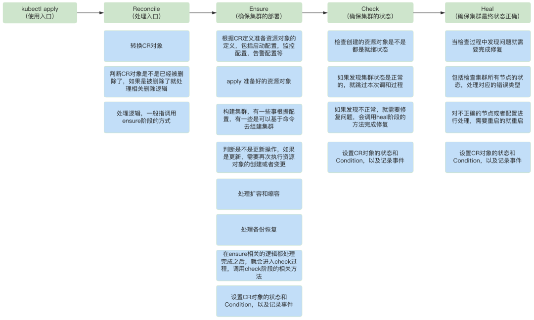 在这个过程中,更关注的是 Operator 的需求收集,有的客户需要的是哨兵模式的,有的客户需要的是集群模式,有的客户只想在开发环境提供单点的模式的。所以这个过程需要判断出,正确的部署支持的模式。并且根据运维的经验,提出合理的玩法和需要的操作能力,这些都是需求的来源。