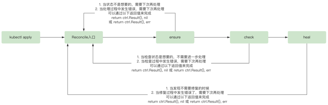 这个是 K8s 的理念,根据定义的配置,不断的调和期望的状态,让被管理的资源对象的状态,逐步得向正确的、期待的方向演进,最终达到正确的状态。这个过程不是一次就结束了,而是不断调和的过程,一旦发现不是期望的状态,就会重复的执行控制逻辑。