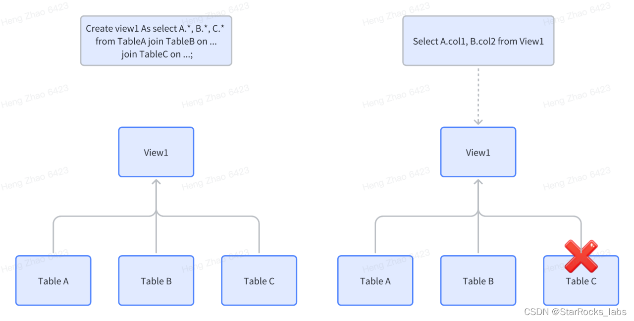 ⚠SELECT view 时,view 中不需要用到的 Table-C 被自动裁剪掉了。使用中需要额外设置一些约束。