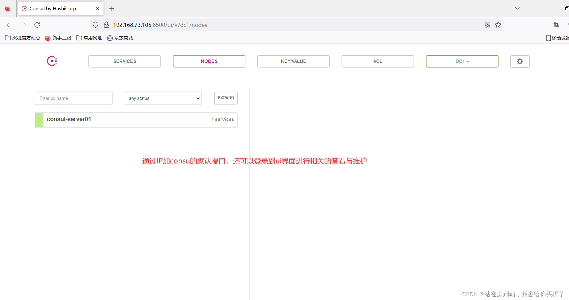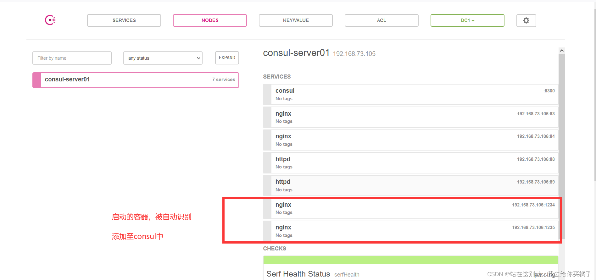 浏览器中,输入 http://192.168.73.105:8500,在 Web 页面中“单击 NODES”,然后单击“consurl-server01”,会出现 5 个服务。