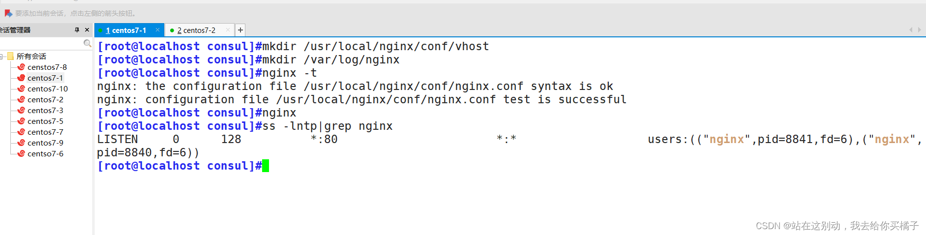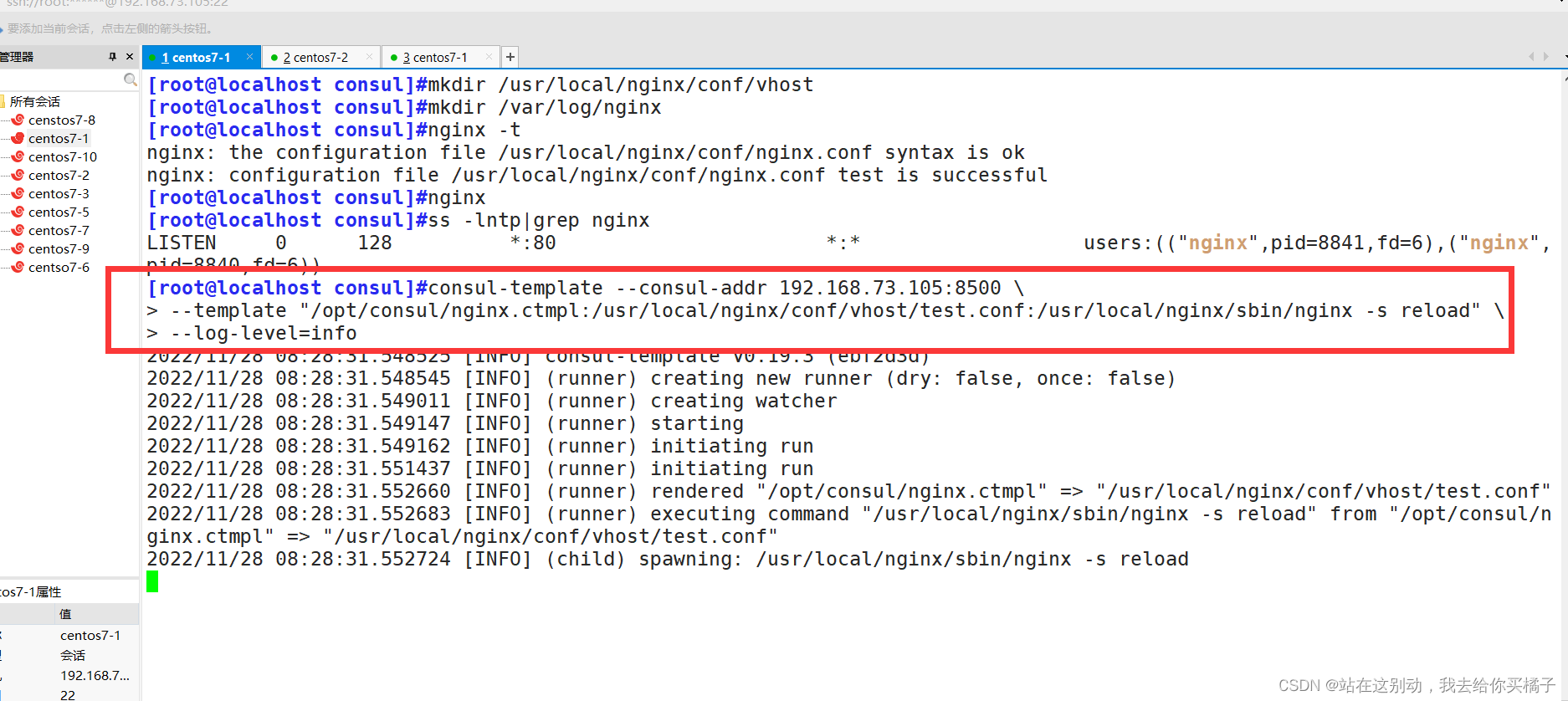 | consul服务器 | 192.168.73.105 | 运行consul服务、nginx服务、consul-template守护进程 |