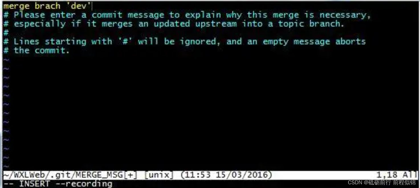 1.按键盘字母 i 进入insert(输入)模式,编辑必要的注释 说明合并的原因,编辑的内容会在第一行显示,也可不修改