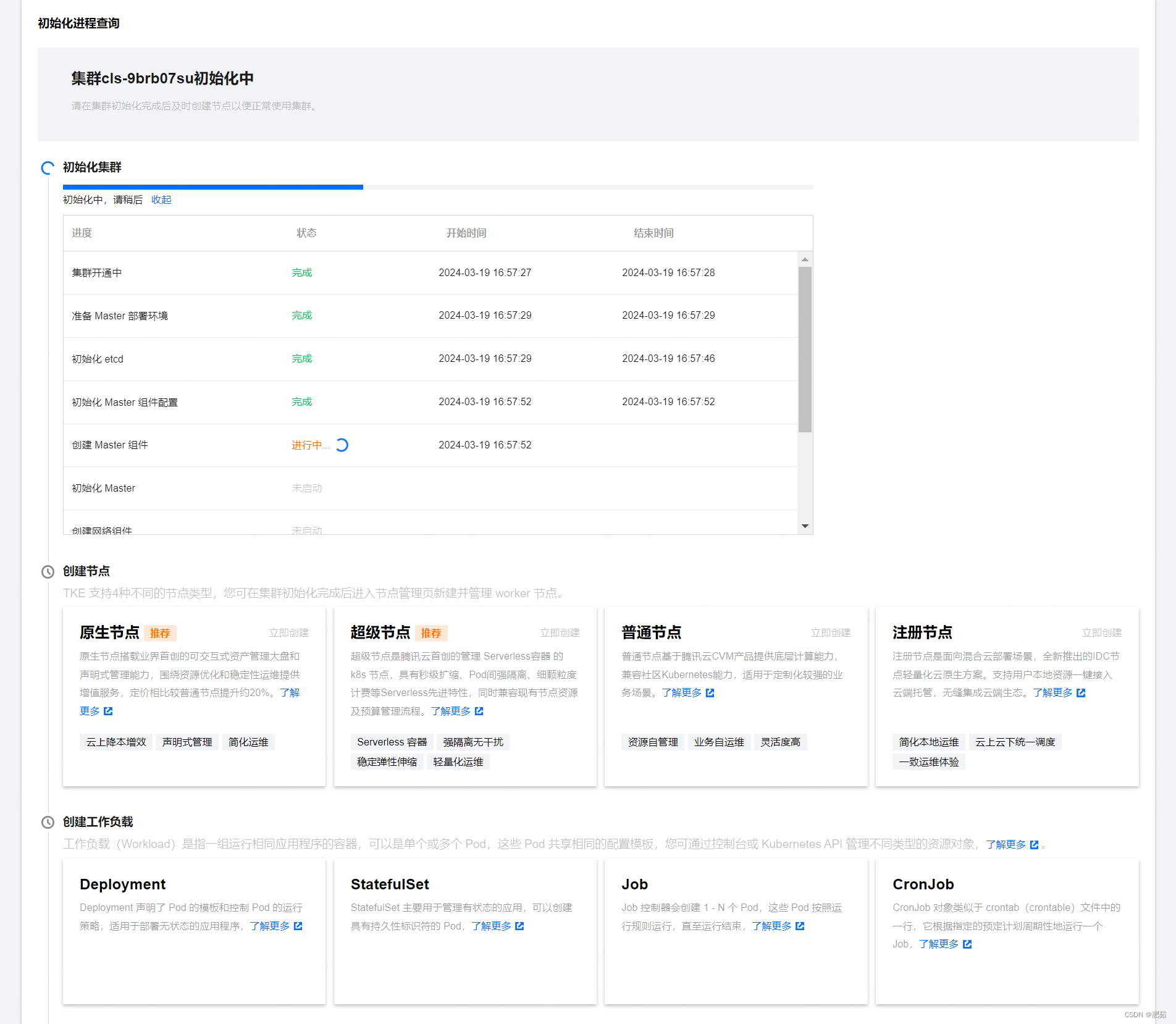 4、 组件配置直接跳过,信息确认,等待集群初始化,等10分钟左右(容器服务需要充点钱才行)