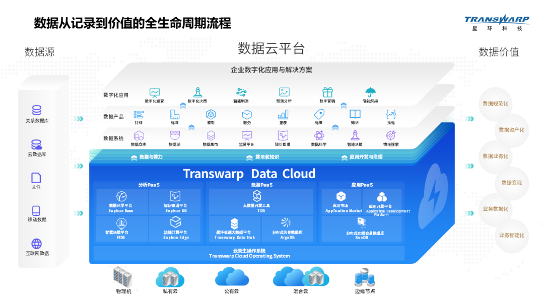 2018 年星环科技,把大数据和云这两条技术进行了融合,星环基于底层云原生基础设施平台,把大数据进行了容器化部署和云原生调度,形成了星环数据云TDC,数据云是以新一代云原生技术为基础,以数据为中心,供完整的数据应用以及分析的开发工具,形成数据和应用互联互通的企业级云服务。