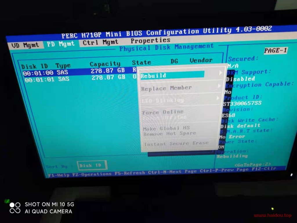 当时我那边显示的是,只有一个LED blinking和Make Global HS选项,这个选项多是因为已经在rebuild状态,当时忘了拍照了,LED是选择闪烁硬盘灯,让人确认是哪个槽的硬盘,Make Global HS是制作全局热备,因为是两块硬盘做的raid1,所以制作全局热备应该就是当做镜像盘,另一块是主盘了,所以制作热备盘会自动rebuild,变成了raid1的第二块盘,个人推测。移动到Make Global HS选项,回车后,会提示是否,选择是,然后就进入了rebuild状态