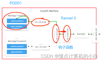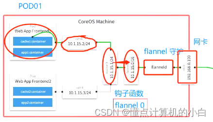 K8S集群中有一个核心组件是ETCDetcd是K8S的核心数据库,存储着K8S集群中的所有资源信息,包括Pod-ip地址的分配,也是由ETCD来定义的。每一个新建的pod都会收到一个新的ip来使用,有一个地址的范围,拿一个少一个,所以每个pod的ip地址是不会冲突的。不管如何都是通过veth对来和docker0网关相连,都是从容器之间出去,并不是pod,上图的10.1.15.0为flanel0在docker0网关和flanel0中会有一个钩子函数