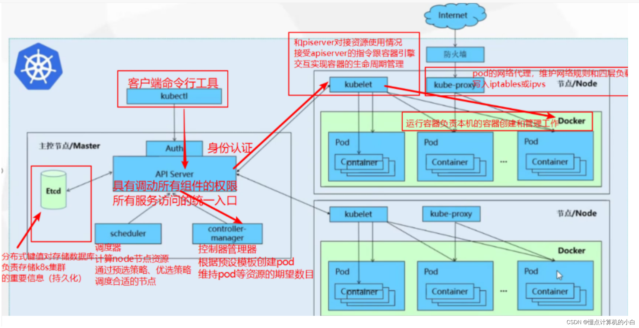 kubectl即命令行,输入的命令,来定义一个pod即向k8s创建一个指令即我需要创建一个pod的指令,从kubectl进来之后因为k8s本身就有安全机制,所以会经过一个auth即权限认证,然后进入一个核心组件即APIserver,(etcd同样也是一个核心,相当于大脑和心脏,本质而言APIserver是一个监控,他负责整个k8s集群的调度和管理,(而etcd是存储整个集群架构的数据与信息,不管APIserver如何进行调度和管理最终都会把数据存放进etcd中,但是其他组件都没有权限去存入到etcd中所以只能通过APLserver来进行存储),因为pod会在node中创建,那么就需要来决定在哪个pod来创建,scheduler组件的功能就是用来做这个事情的,pod创建了之后就需要有人来维护和管理那么就需要controller manager来管理,控制和维护了,它的作用就是用来维护pod状态以及满足我们的这个期望值(期望pod的数量)相当于控制中心,所以当创建pod的请求通过AUTH进入到APIserver后就会借助这两者来进行创建,管理,维护动作,最后所有的动作信息全部汇总到APIserver。