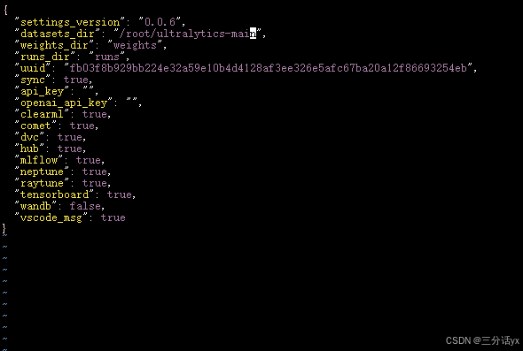 回到根目录,来到/root/.config/Ultralytics/路径下,使用vim打开settings.json进行编辑。
