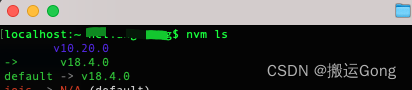 等安装完之后,使用 nvm ls 命令,可以查看自己当前电脑中已安装的版本列表: