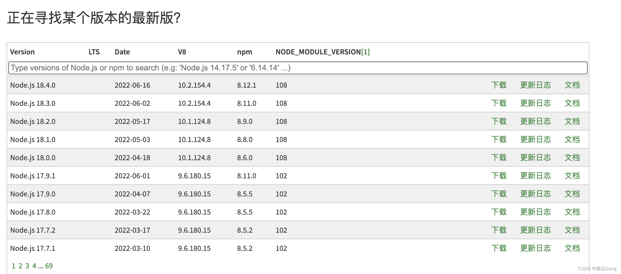 如果感觉上面的命令找版本不方便,也可以使用 node.js 官网提供的历史版本进行查找: