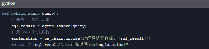 用户输入 → 意图识别 → 路由到 SQL Agent 或 RAG → 执行查询 → 结果生成 → 返回自然语言回答