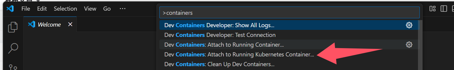 安装该插件后,在vscode的view下的Command Palette搜索container,选择containers: Attach to Running Container