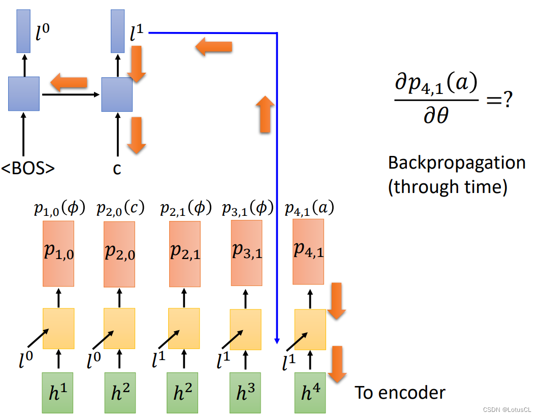 因此在下一步计算过程中,我们将 h2 和之前的 l0 一起输入编码器,输出得到概率 p_{2,0}。那么产生 c 的概率也就好算了,就是从概率分布 p_{2,0} 中采样得到 c 的概率。