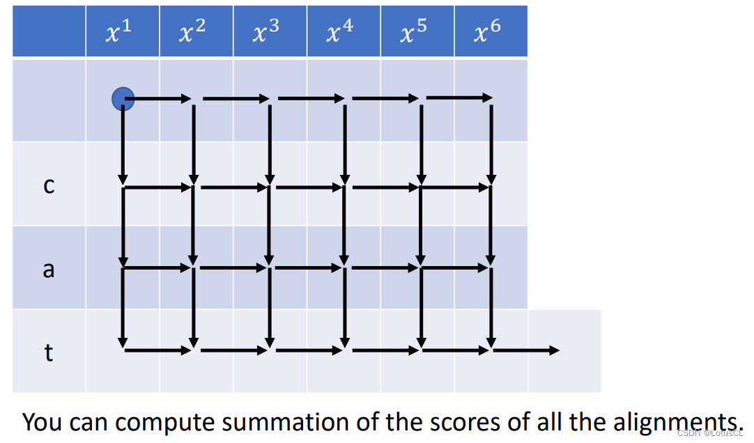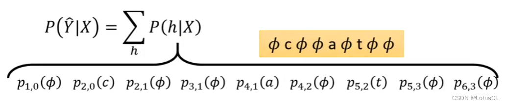 我们将一个 alignment 通过状态图的方式表现出,实际上,需要计算这个 alignment 的概率,只需要将所有位置的概率进行连乘就行。比如h = ∅c∅∅a∅t∅∅。P(h|X) 就等于每个位置的发射概率和转移概率的连乘,也就是第一次输出 ∅ 的概率,乘以给定 ∅,输出 c 的概率,乘以给定 ∅c,输出 ∅ 的概率……