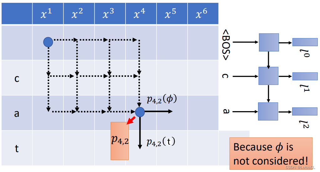我们看下图,实际上下图中的每一个格子都可以对应到一个概率分布,由于刚刚定义的概率分布的下标分别表示读到的声学特征向量以及已输出的token数量,那么格子对应的概率分布就显而易见。比如图中给出了 p_{4,2} 的概率分布的格子,这就表示我们已经读到 x4,并且前边已经输出了两个 token ca。