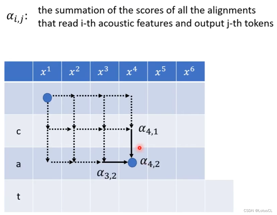 我们新定义一个变量 α_{i,j},其表示已经读取了 i 个的声学特征向量,输出 j 个 token 的所有对齐方式的概率分数之和。比如 α_{4,2},就是由读取 4 个声学特征向量,输出 2 个 token 的所有 Alignment 的分数相加之和。