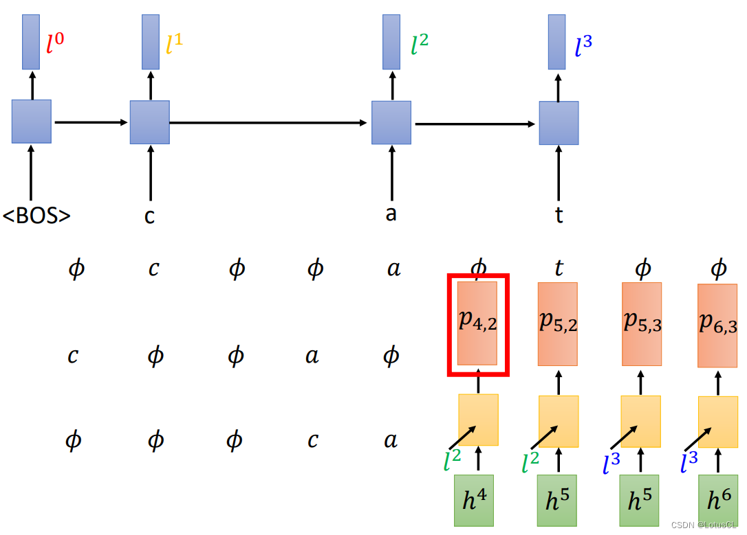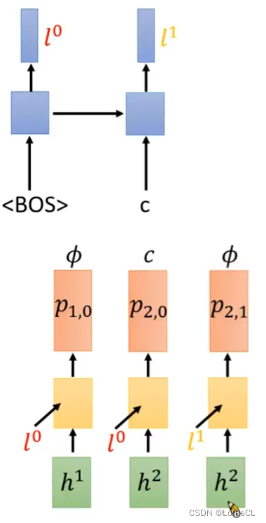 接下来该计算有 ∅c 后产生 ∅ 的概率。由于我们刚刚输出了 token c,RNN 就会受到影响,输入 token c 以后产生 l1,而 Encoder 不变,因为它没有看到 ∅,所以不需要更换向量。因此我们最终将 l1 和 h2 丢给解码器,得到新的概率分布 p_{2,1},从中我们可以得到我们需要的概率。