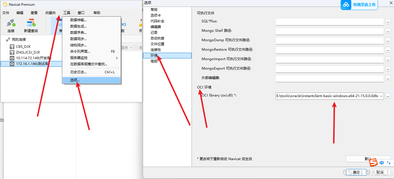 connection to server failed,probable Oracle Net admin error(与服务器的连接失败,可能是Oracle Net管理员错误)点击'工具-选项-环境' 更换oci.dll文件路径(就是你刚下载的文件夹里面的oci.dll文件)Oracle library is not loaded(未加载ORACLE库) 或。下载完之后打开navicat客户端。