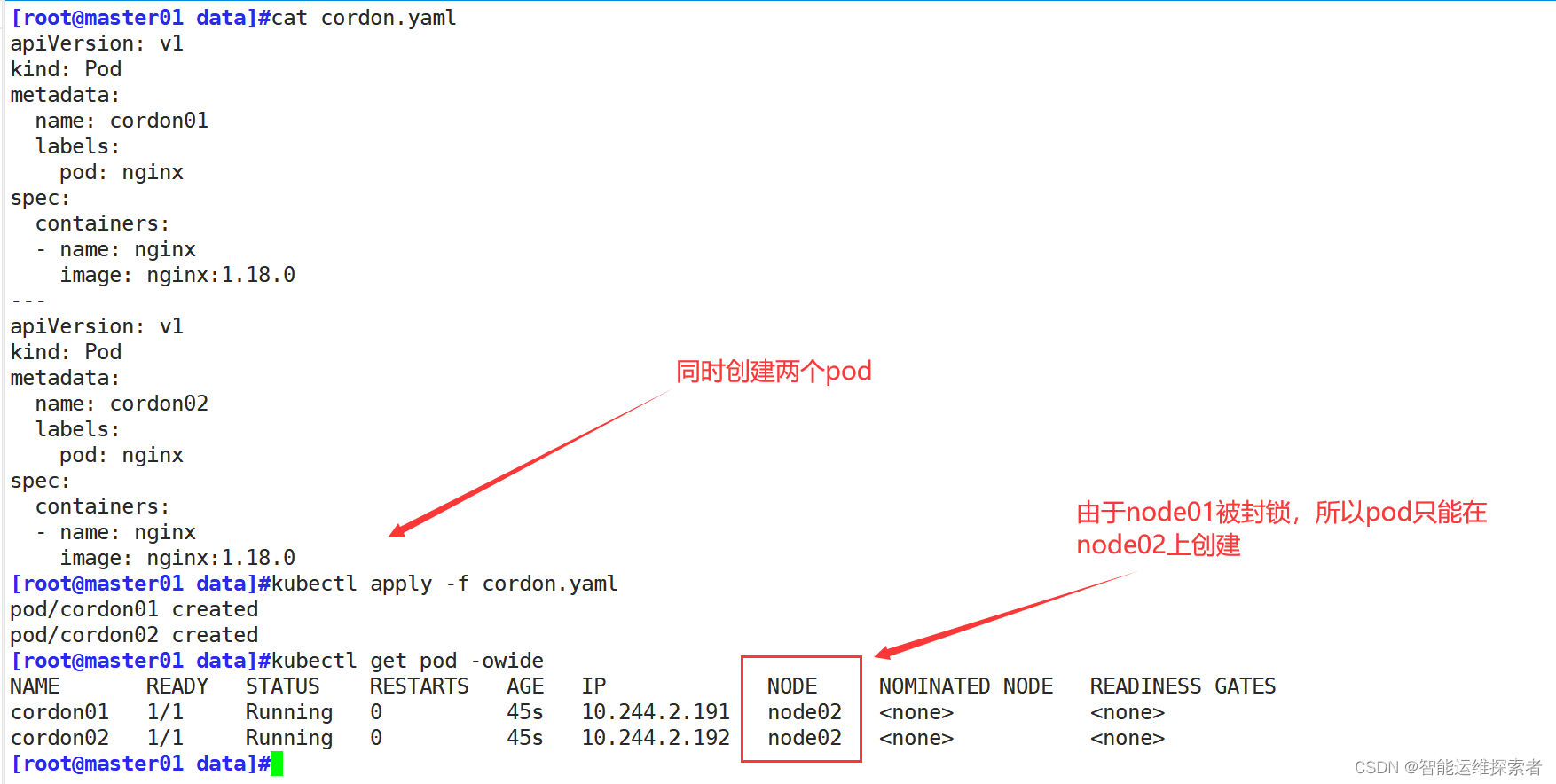 作用:阻止新的 Pods 被调度到该节点上。当一个节点被标记为 cordon 时,已经在该节点上运行的 Pods 不会被驱逐,但新的 Pods 不会被调度到这个节点。