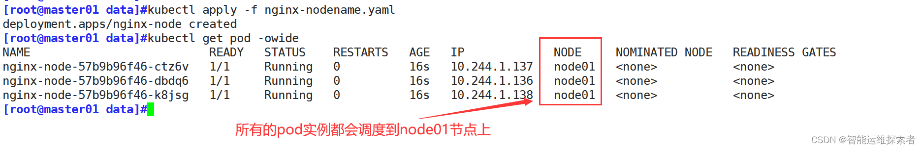 当Pod的spec.nodeName字段被设置为某个Node的名称时,Kubernetes调度器(kube-scheduler)会直接将该Pod调度到指定的Node上,而不会考虑其他的调度策略和规则。
