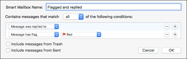 Let’s create another simple smart mailbox so you get the idea. In this example, we’re going to create a smart mailbox in which messages have been both replied to and flagged. This means that each message must meet all the requirements to be part of the mailbox.