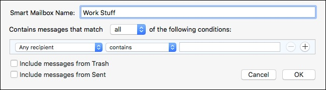 This rule isn’t too complicated. Further, messages won’t be affected such as they can be with rules. For example, messages won’t be flagged, colored, or anything to change the message’s appearance, they’ll simply be gathered according to criteria stipulated in the smart mailbox rule.