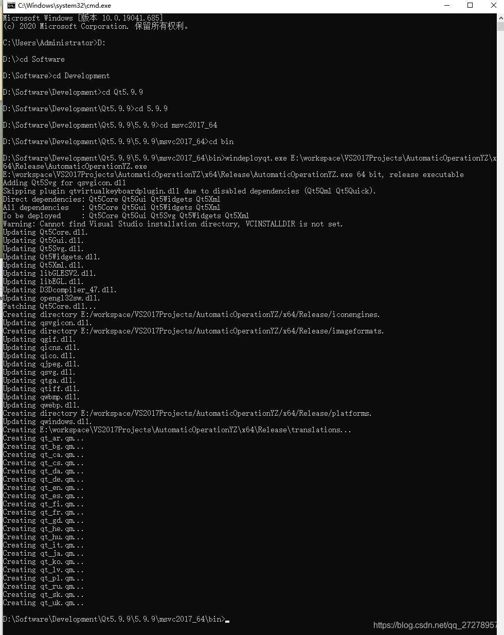 1、通过windows的命令提示符,进入到Qt安装环境的bin目录(我用的是msvc2017_64版本),
