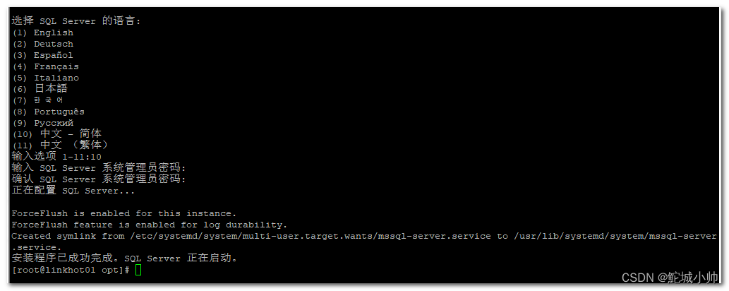 以上在Linux中安装SQLServer成功。CSDN已有完整安装流程,亲测可用。在虚拟机安装要注意:内存必须不小于2个G。这里我选择2号版本。