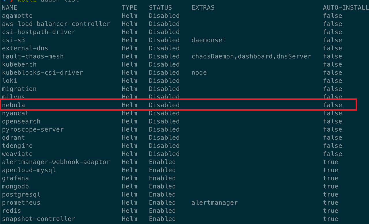 注: 如果在列表中,没有找到 nebula addon,请检查下你安装的软件版本,确保已安装新版本的 kbcli 和 KubeBlocks。