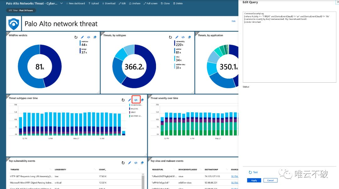 进入仪表板后,可以看到威胁会按种类,来源的应用及时序的量值按重要性依次从上到下排列在仪表版上,如果您对于默认所展现的列别以及展示的时间段等信息想进行修改,都可以点击各块信息右上角的”Edit Query”来修改所要展示的信息。