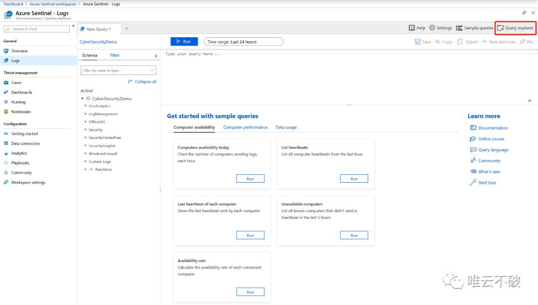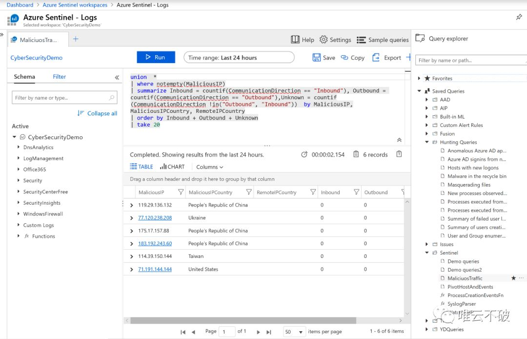 上述的仪表版只能对于日志呈现一些简单的,大局上的信息,如果需要对于特定的安全事件进行搜寻,则可以通过左侧栏中的“Logs“来对不同日志源中的数据进行统一的搜索和排查。整个Log平台依托于微软的Log Analytics以及Azure Monitor这两个组件,每天都会帮助客户处理10 PB以上的日志数据,客户只需通过短短的几行搜索命令就能够进行复杂的搜索逻辑,并且不需要考虑底层计算平台的算力,快速返回所查询到的结果。