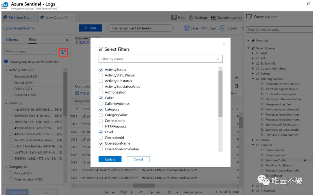 另外,很多常用的搜索逻辑,比如查找异常登录信息,可疑IP地址段的提取等,你都可以直接在右侧的Query Explorer中利用微软安全团队已经生成的查询模板,就能够针对你接入的日志数据进行查询,查询的结果你可以根据需要,通过表单形式或者柱状图或者饼状图的形式展现在下方的结果显示栏中。