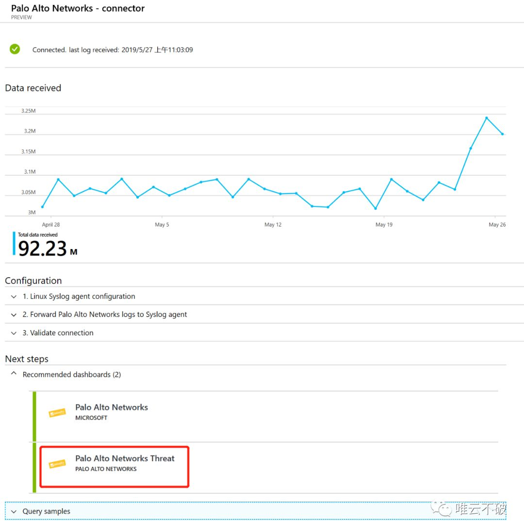 实例中,我们点击Palo Alto进行配置,之后就可以看到Palo Alto那边的流量信息已经展现在面板上,此外,Palo Alto还与微软合作,将其搜集到的信息,分别由微软和Palo Alto各制作了一款完整的仪表板来展现客户所关心的日志信息的汇总。我们点击Palo Alto设计的仪表板。