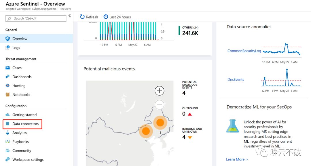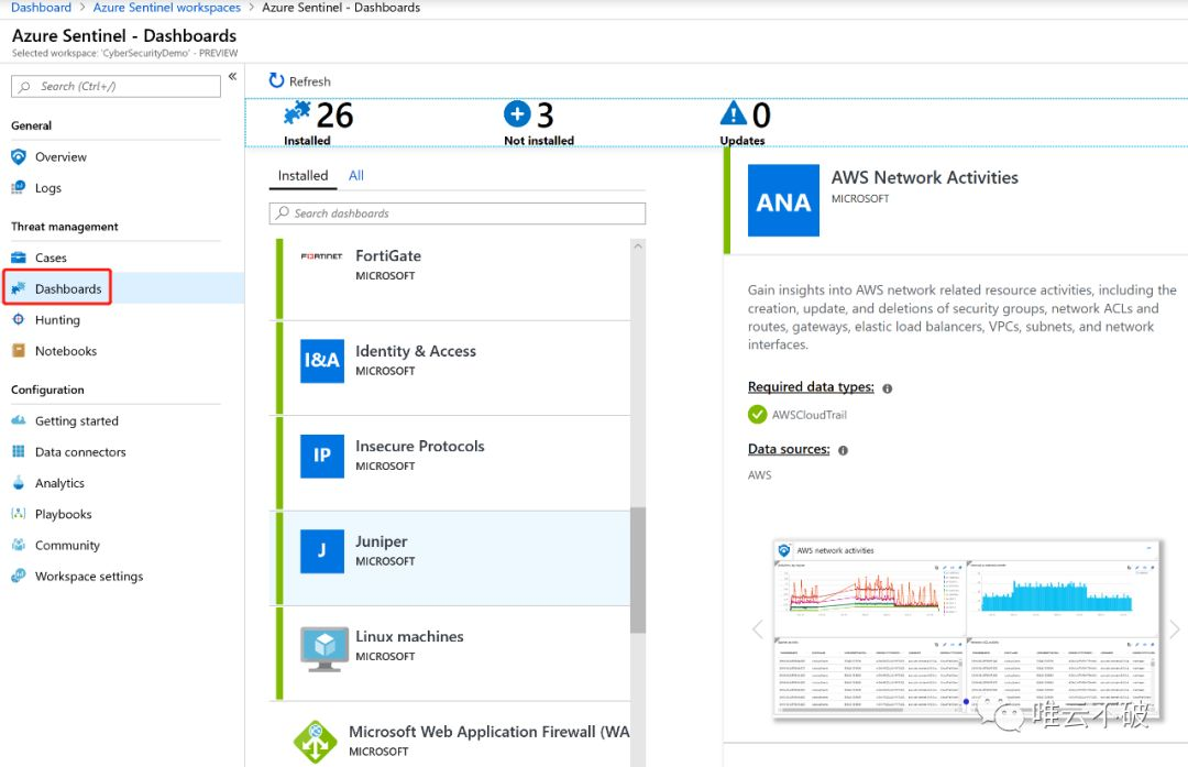 当你接入好所有一方和三方的日志后,你可以回到首页,从Azure Sentinel左侧的Dash board中看到所有连接的log日志。并且你可以为不同的用户,设定他所可以查看的仪表版中所能看到的数据的权限,来符合所需要满足的合规要求。
